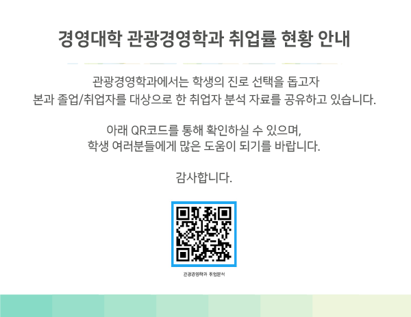 동아대학교 관광경영학과관광 경영의 혁신, 미래의 여가산업을 선도할 핵심 인재를 양성국민의 건전한 여가 선용과 외국인 관광객 유치를 위한 제 기법에 대해 이해하며, 관광 및 환대사업 현장에 필요한 전문 인력을 양성합니다